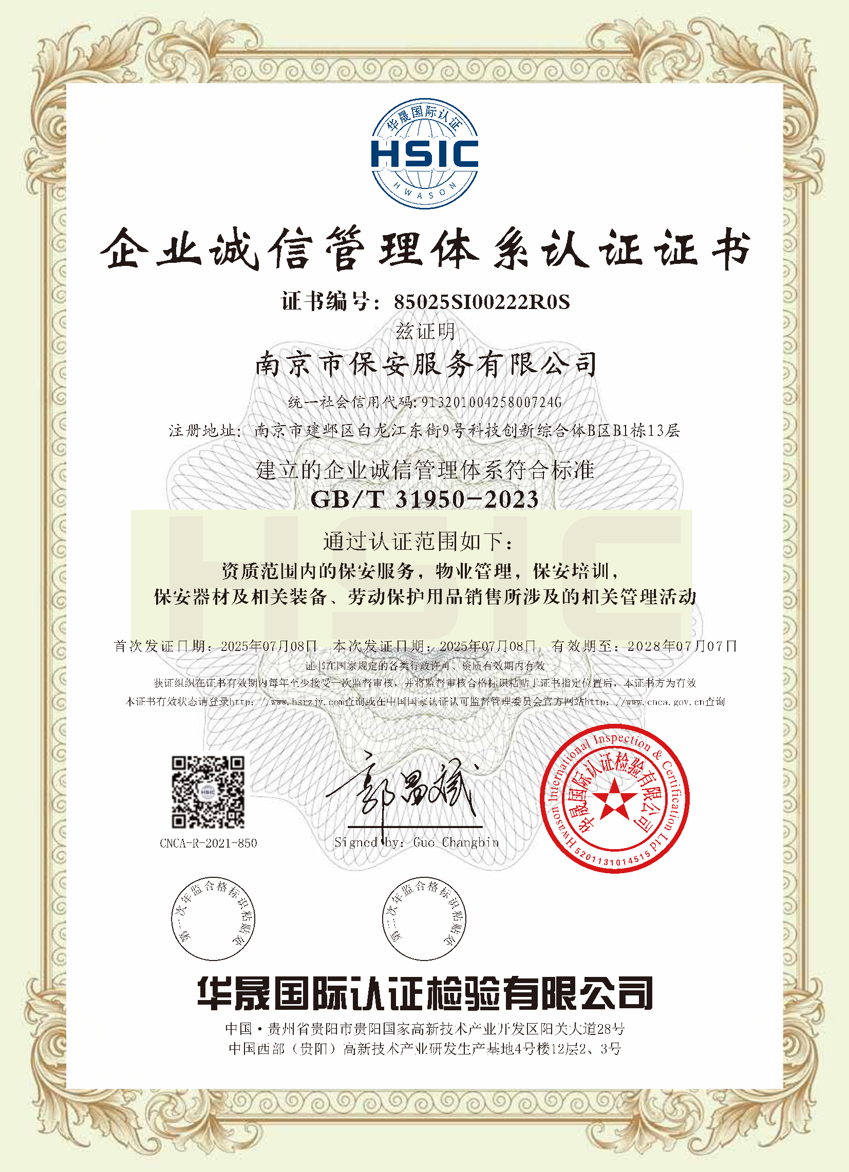 南京市保安服務有限公司(原南京市保安服務總公司)成立于1987年4月,是一個有著悠久安保經(jīng)營歷史和安保經(jīng)驗沉淀的大型國有保安企業(yè),現(xiàn)為中國保安協(xié)會常務理事單位,江蘇省保安協(xié)會常務理事單位,南京市保安協(xié)會副會長單位,江蘇省一級保安服務公司。
